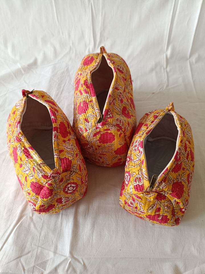 Eco-Friendly Fashion Large Capacity Women's Fruit Pattern Hand Block Printed Cotton Quilted Travel Makeup Pouch with Zipper