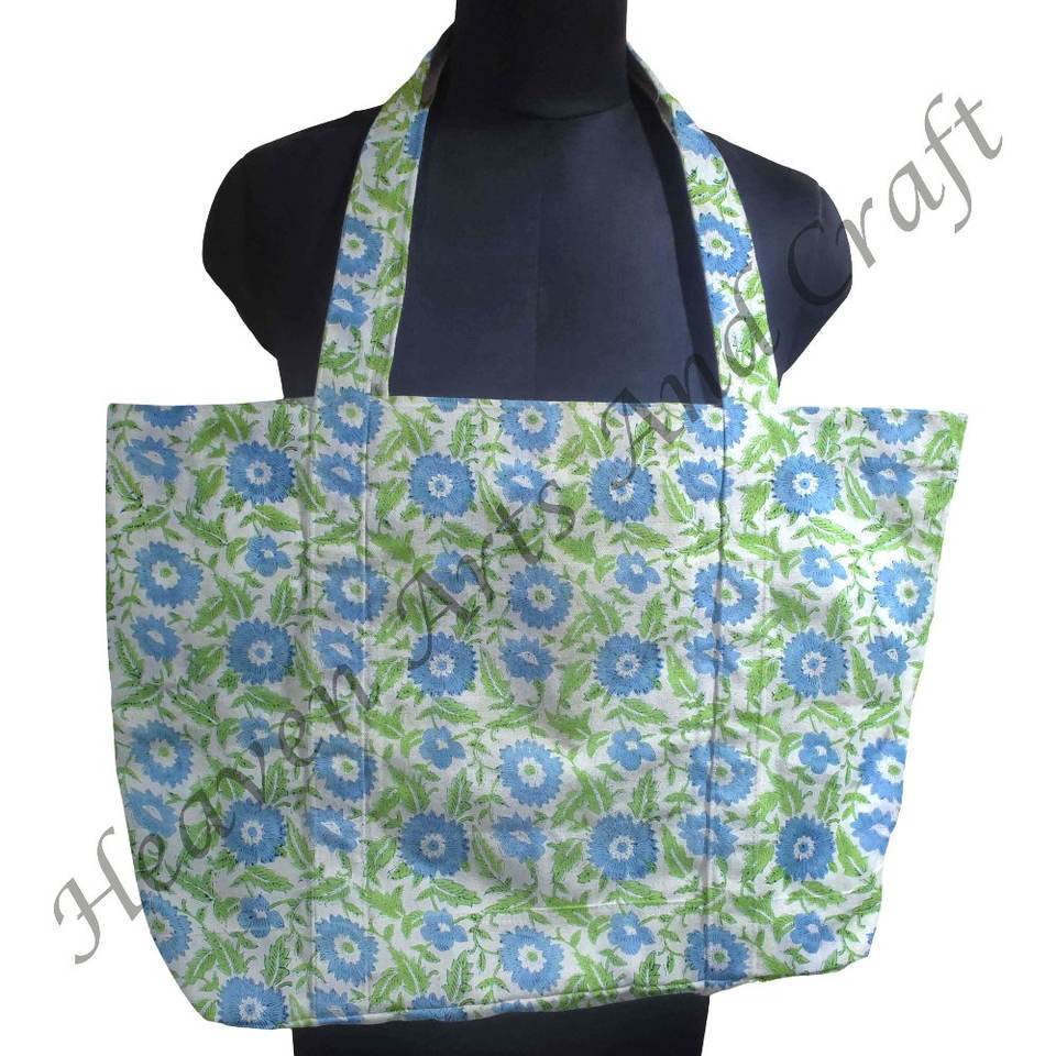 Eco Friendly Floral Cotton Canvas Lightweight Beach Shopping Bag Handmade Block Print Tote Bag With Handy Inside Pocket