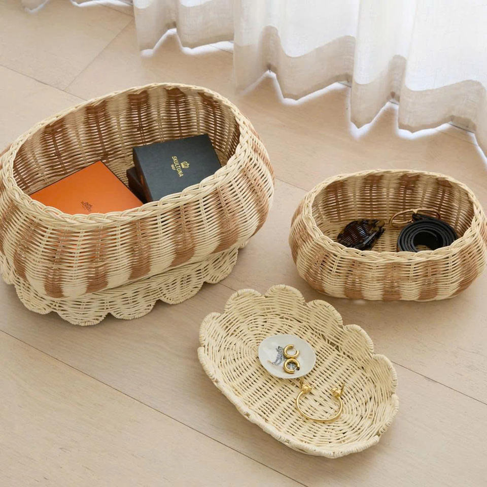 Eco Friendly Handwoven Rattan Storage Basket Set With Handle Scalloped Wicker Organizer For Nursery Toy Storage Home Decor