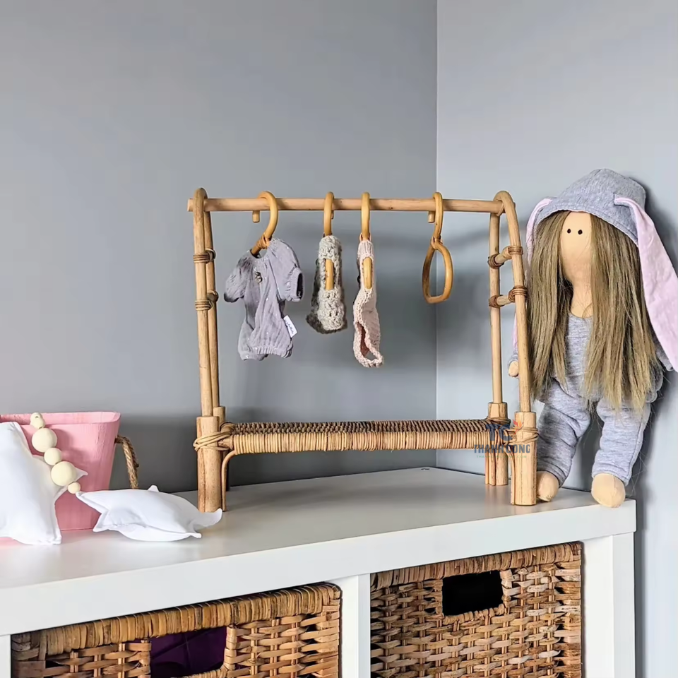 Eco-Friendly Kid Interior Natural Rattan Doll Clothing Rack Mini Rattan Clothes Rail Rack for Playing Room Kids Room Handmade