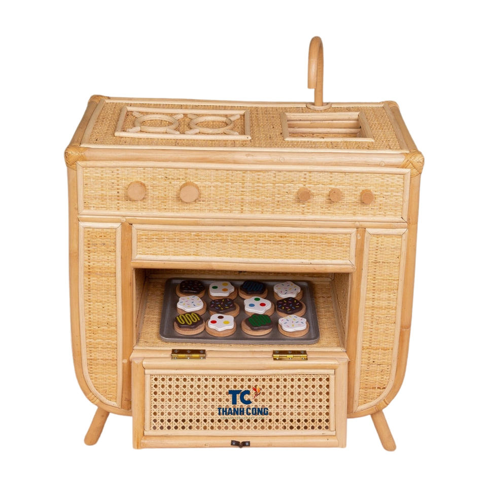Eco-Friendly Kids Rattan Play Kitchen Stand Pretend Doll Furniture