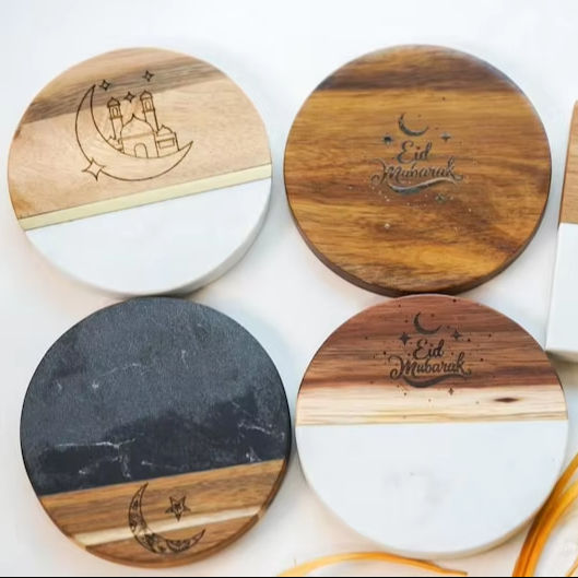 Eco-Friendly Mango Wood Coasters in Decorative Box, Polished Wooden and Stone Drink Pad Set for Gifting, Export, Wholesale