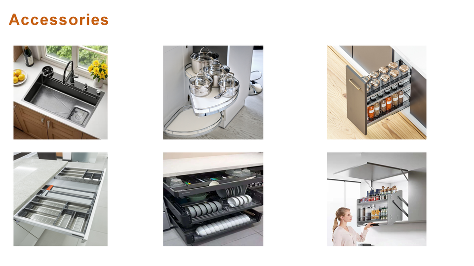 Accessories:Backsplash, Drawer Basket, Drawer Slide, Faucet, Handle & Knob, Hinge, Lazy Susan Storage, RICE BOX, Sink, Toe Kick, Waste Container
