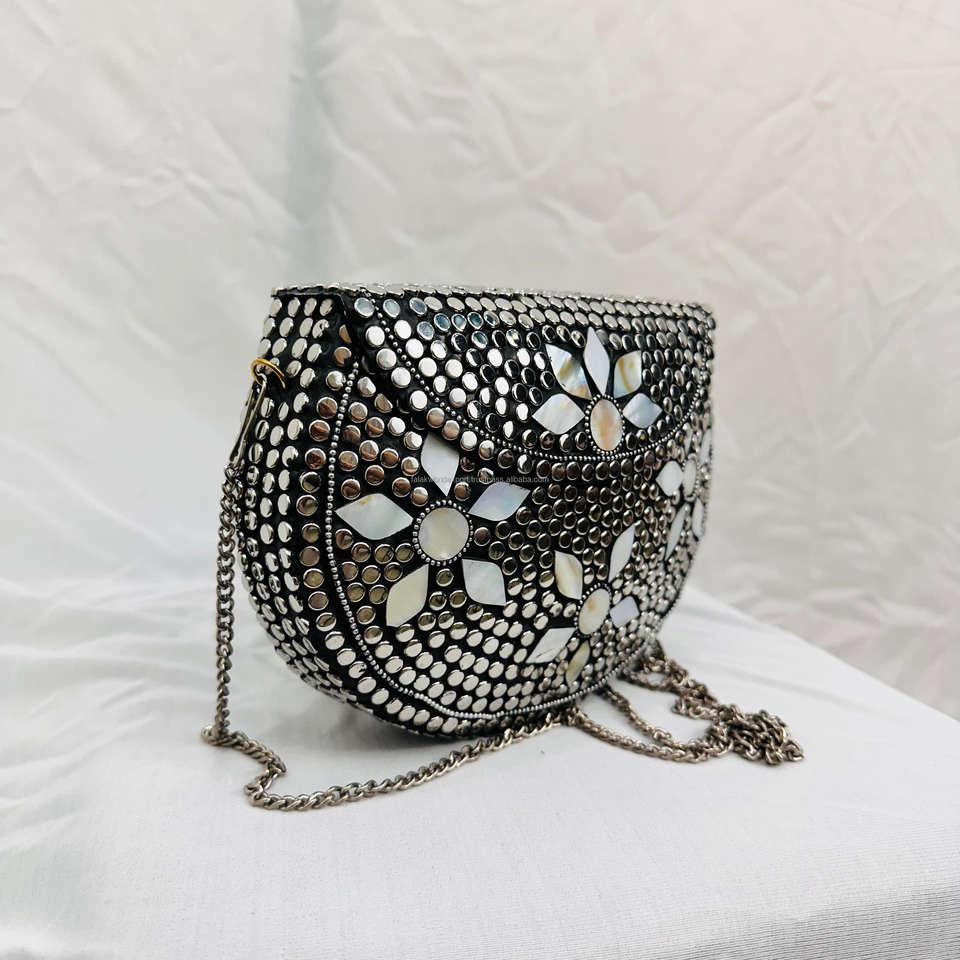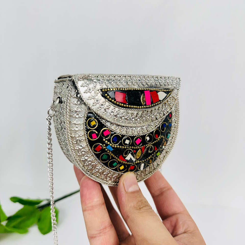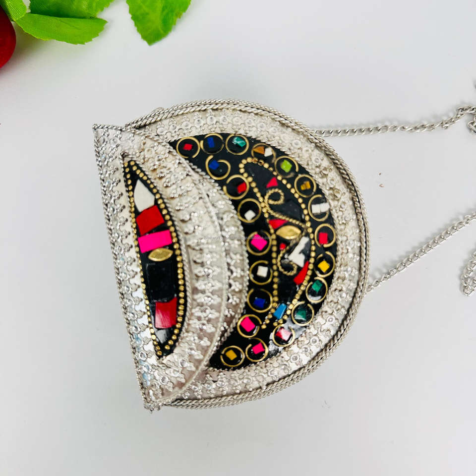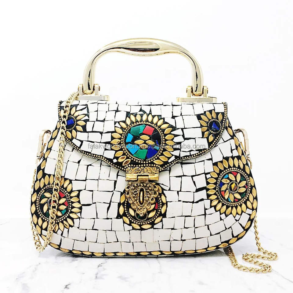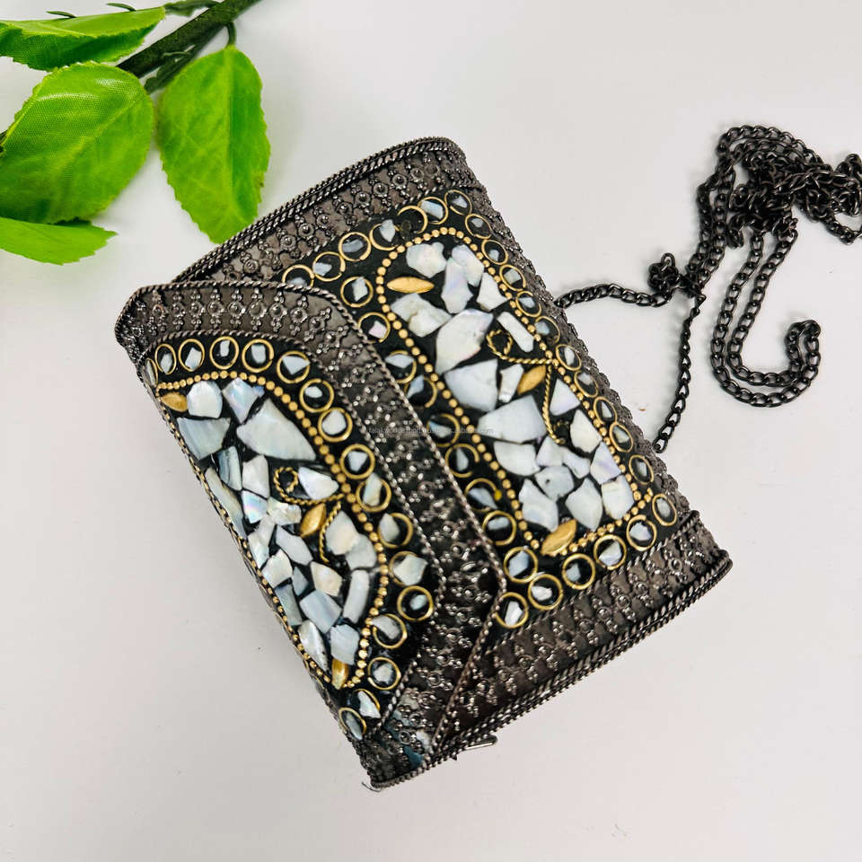 Eco Friendly Mosaic Clutch Bag Gold and Silver Tone Stone and Brass Stud Sling Bags Boho Fashion Purse Collection By FWE