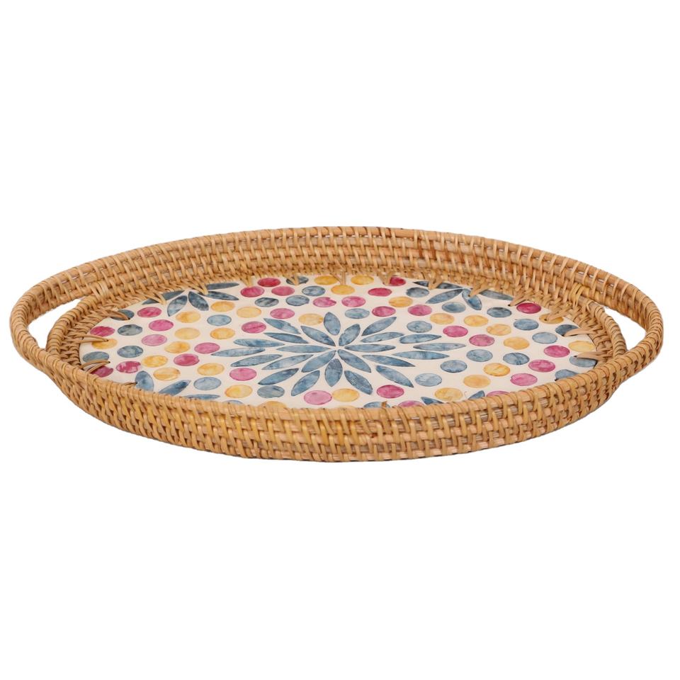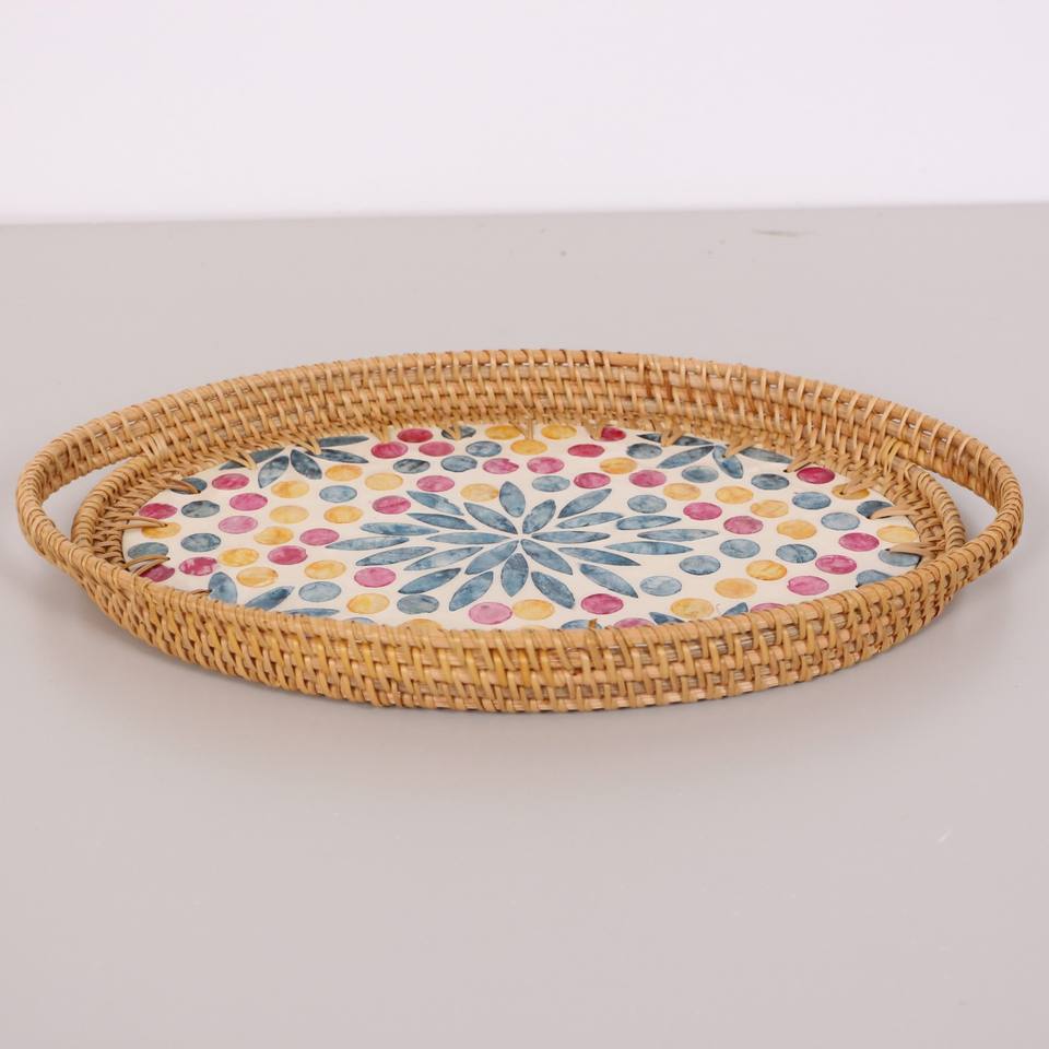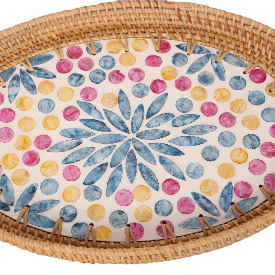 Eco Friendly Mother Of Pearl With Rattan Serving Tray Oval Color Dot Pattern Handmade Bulk For Hospitality Storage Food Drinks