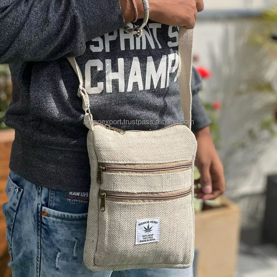 Eco-Friendly Natural Hemp Crossbody Sling Bag with Multiple Zipper Pockets Handmade Small Shoulder Bag for Travel & Daily Use
