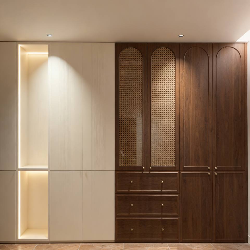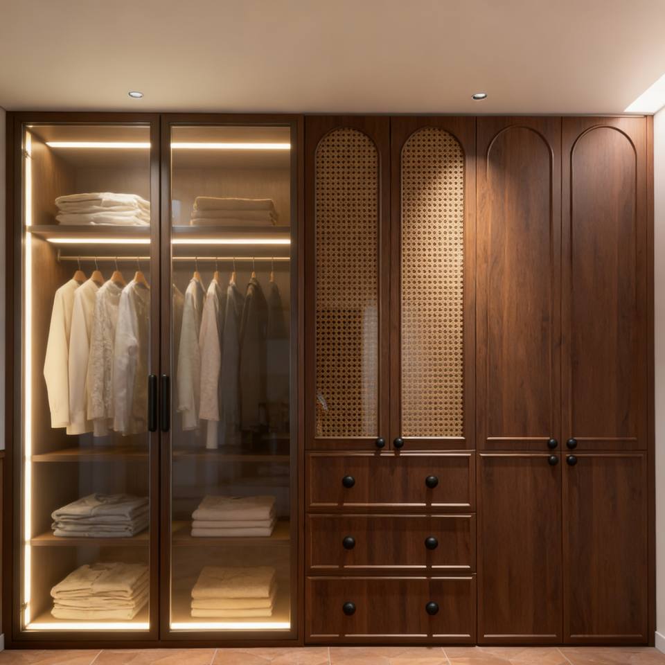 Eco-Friendly Norse Style Modern Solid Wood Wardrobe Custom Build With Glass-Door Lit Storage & Rattan Detail Accents