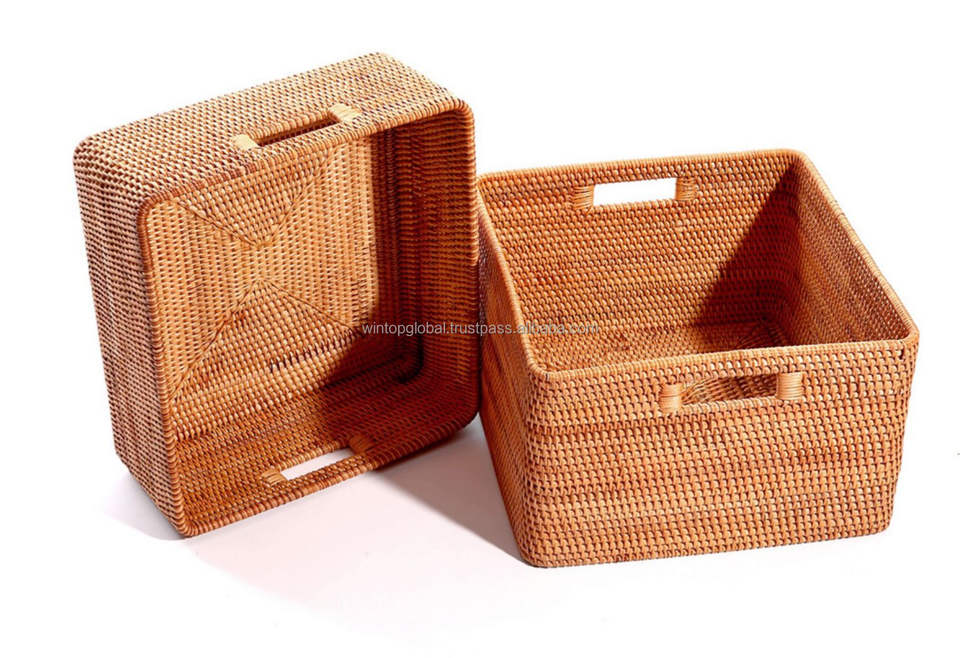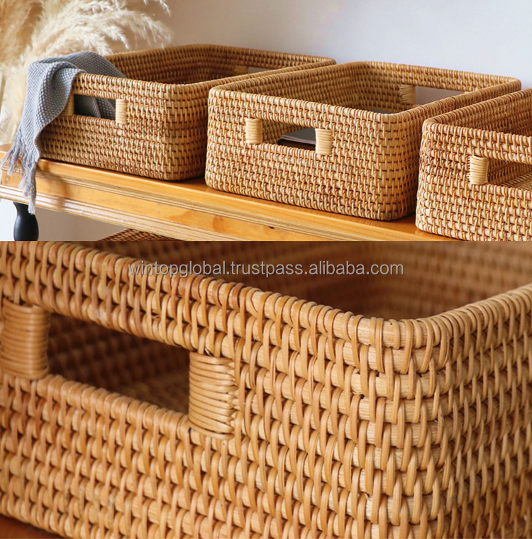 Eco-Friendly Plant Fiber Natural Rattan Rustic Rectangle Multi-Purpose Home Organization Storage Baskets
