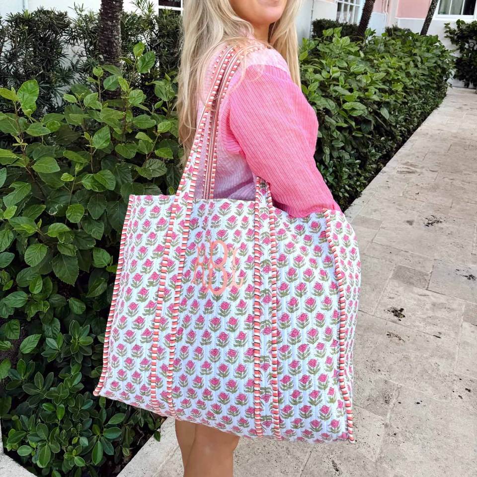 Eco Friendly Quilted Cotton Beach Tote Pink Striped Floral Market Bag OEM ODM Private Label Available Floral Shoulder Tote