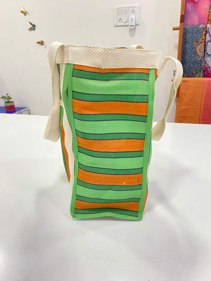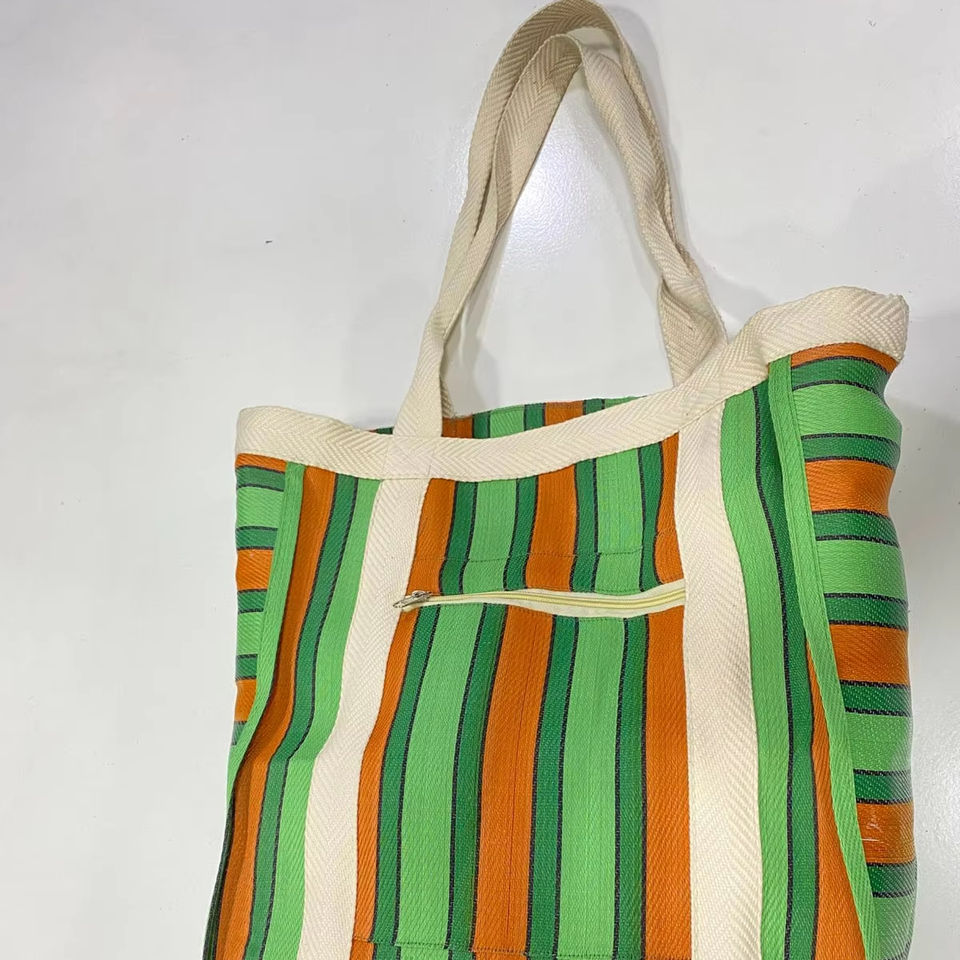 Eco-Friendly Reusable Nylon Shopping Bag with RPET Zipper Handloom Woven Striped Recycled Plastic Beach Bags Made in India