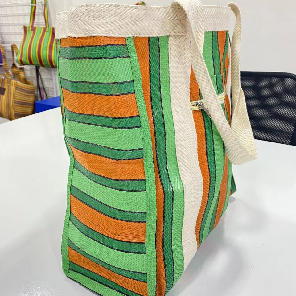 Eco-Friendly Reusable Nylon Shopping Bag With RPET Zipper Striped Handloom Woven Recycled Plastic Beach Bags Made in India