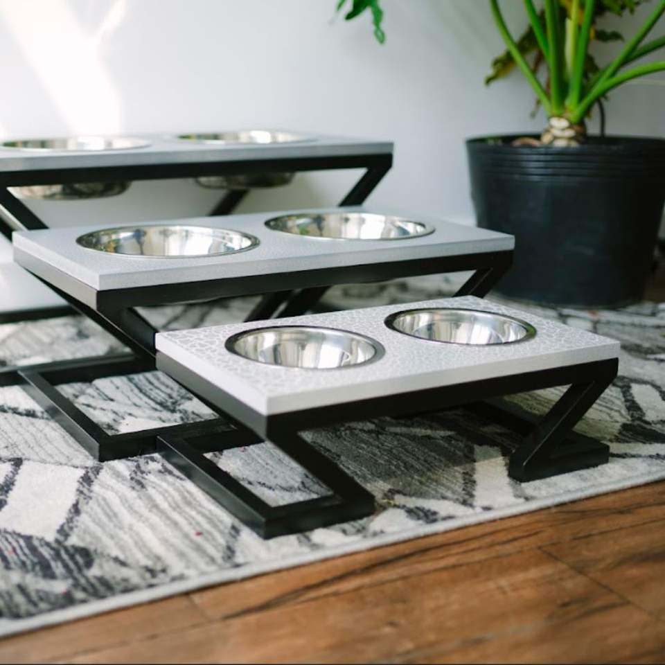 Eco-Friendly Stainless Steel Pet Bowl Feeder for Dogs & Cats with Wooden Top and Black Metal Frame for Food and Water