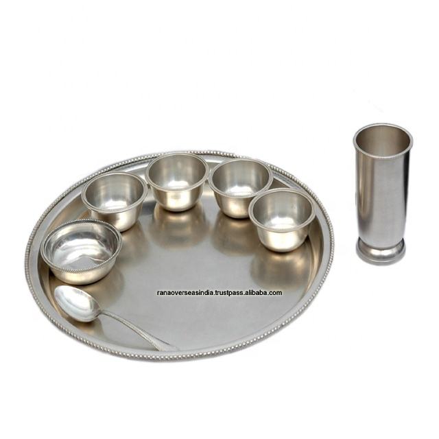 Eco-Friendly Stainless Steel Traditional Dinner Set Thali Plate Dessert Bowls Gold Inlay Design Novelty Style Includes Glass