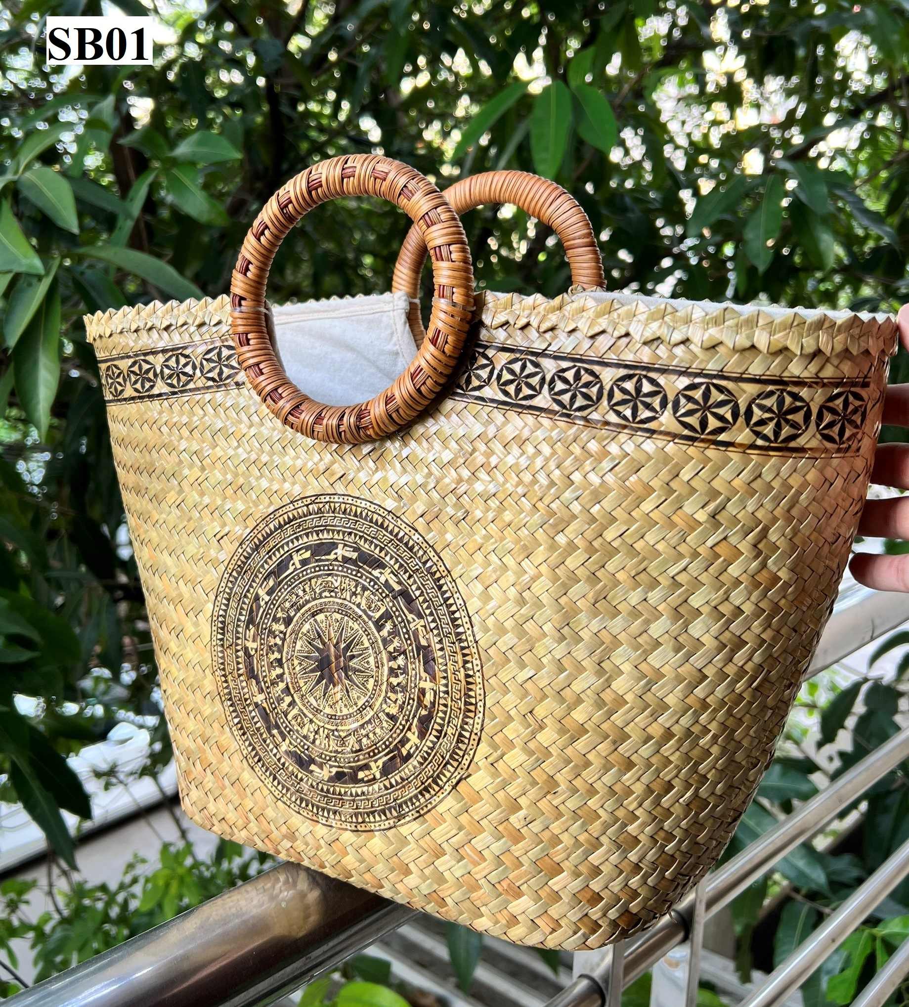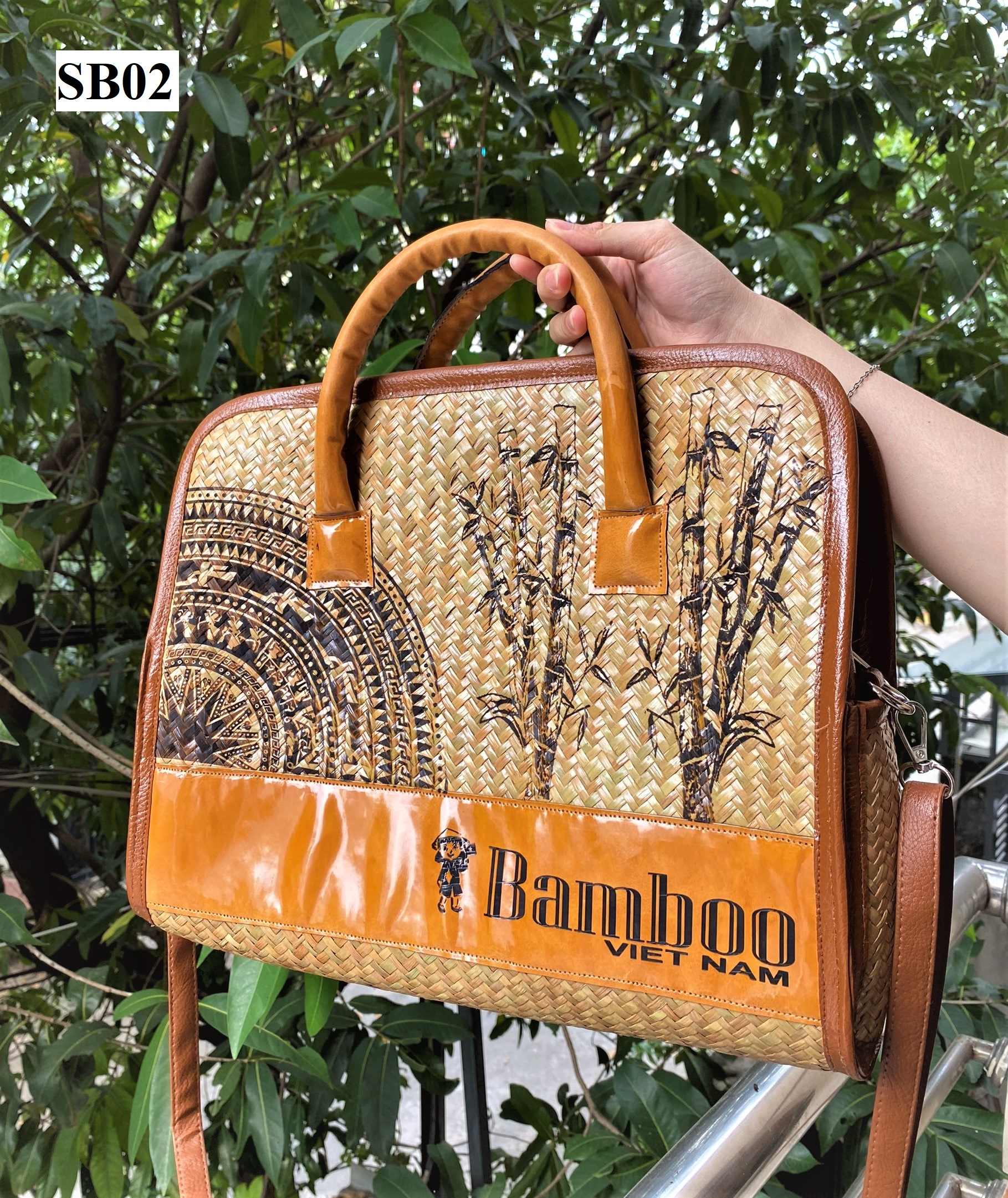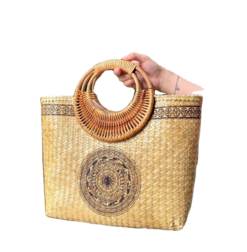 Eco Friendly Straw Handbag with Rattan Handle Combined Meticulously Painted Motifs From Vietnam Factory