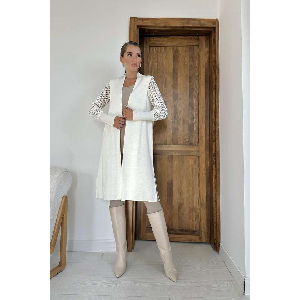 Eco-Friendly Women's Off-White Knitted Cardigan With Sheer Layer Minimalist Style Long Sleeve Vest Top Ecru Color