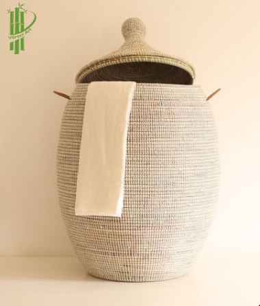 Eco-Friendly Woven Seagrass Belly Basket With Handles for Storage, Laundry, Picnic, Woven Plant Seagrass Laundry Basket With Lid