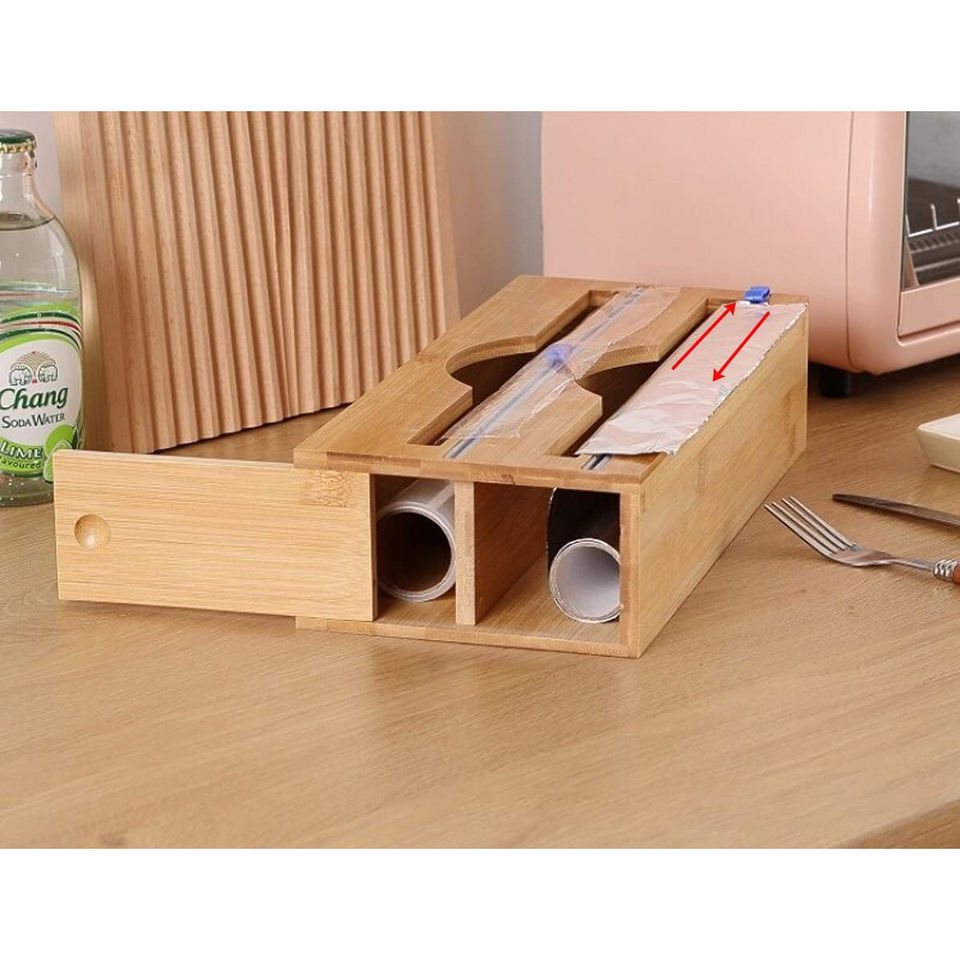 Eco Natural Bamboo Wood Plastic Wrap Organizer Premium Foil Dispenser Plastic Wrap Dispenser With Slide Cutters