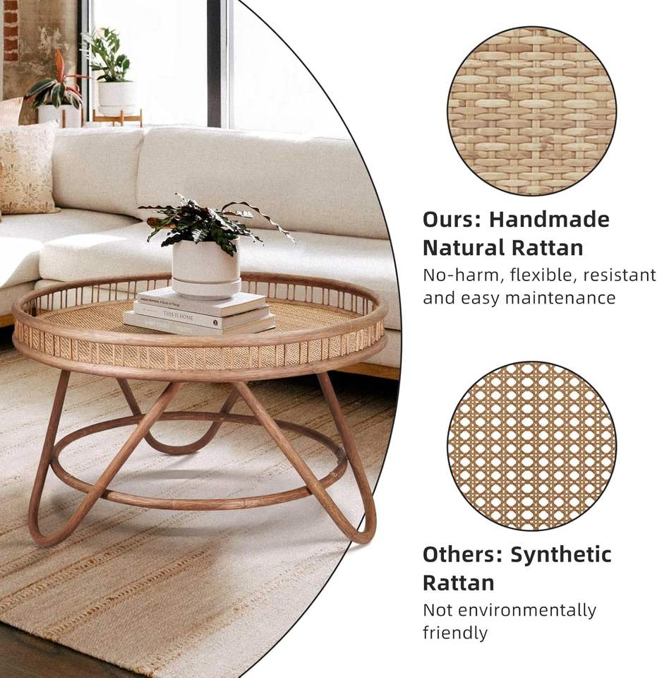 Eco-friendly Round Rattan Coffee Table 32x18'', Handwoven Rustic Style Round Wicker Coffee Table for Home Hotel OEM ODM