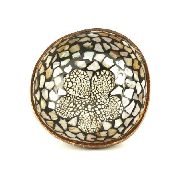 Eco friendly lacquer coconut bowl with seashell decoration ideal for sustainable hospitality kitchens or home display