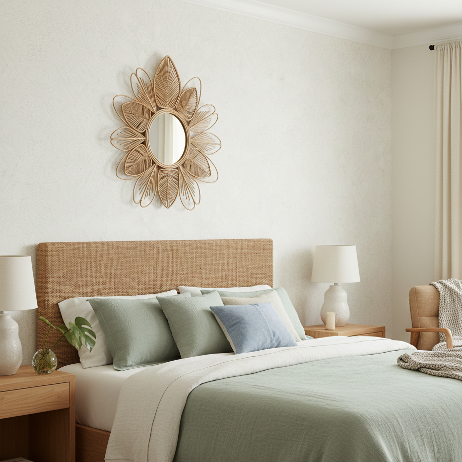 Econa's Eco-Friendly Handmade Rattan Bohemian Round Wall Mirror Lightweight Durable with Framed Edge Decorative Flower Design