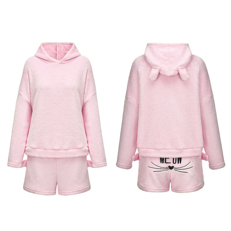 Ecowalson Cute Pajama Sets for Women Winter Hooded Sleepwear Flannel 2 Pcs Pyjama Suits Femme Cartoon Cat Pijama Feminino