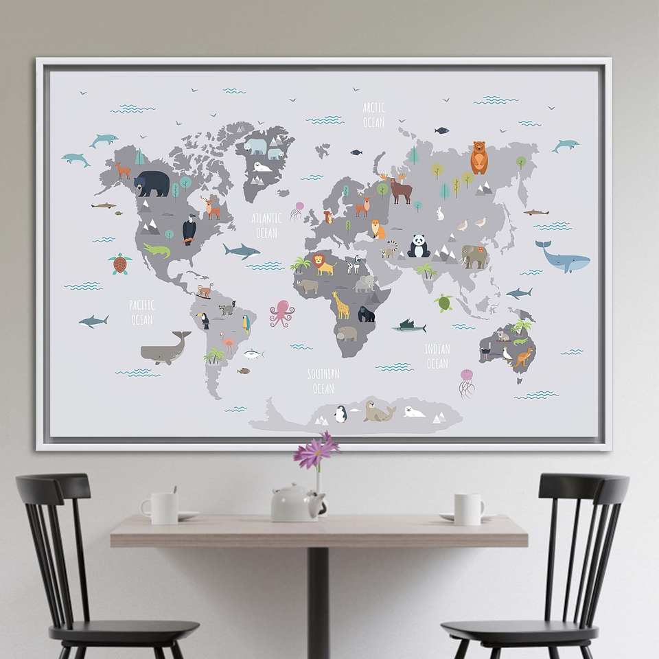 Educational World Map Kids Room Art Canvas - Printed Wall Decor,1P:White Framed