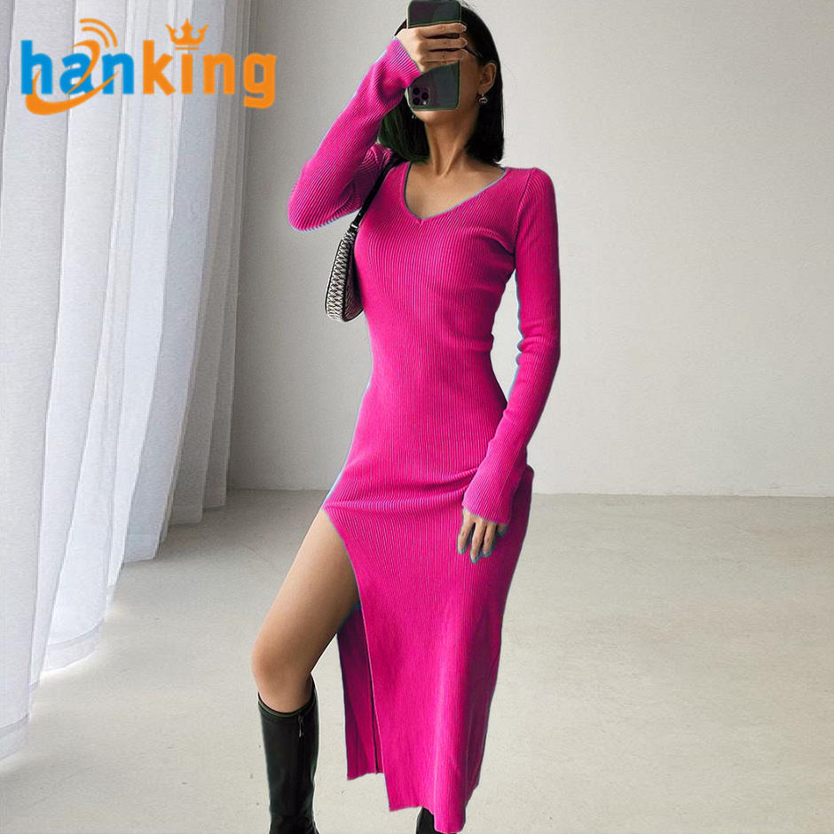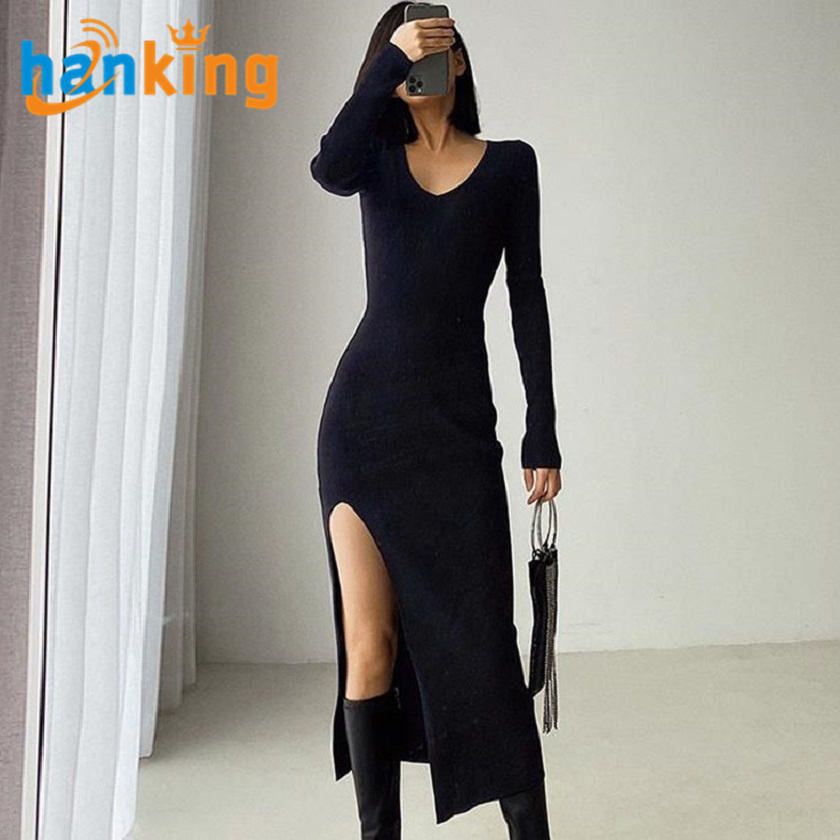 Ehanking Spring and Winter Sexy French Slit Sweater Dress Female Slim Tight Fitting Hip Knit Over the Knee Dresses