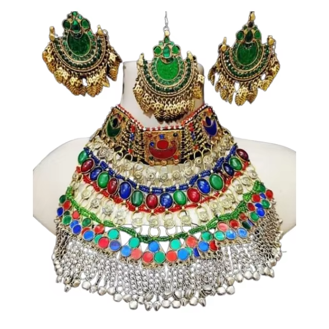 : Elaborate Traditional Afghan Tribal Jewelry Set With Colorful Beaded Necklace And Matching Green Kuchi Earrings Designed