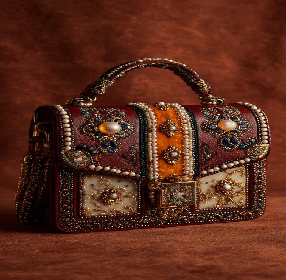 Elaborate jewel-toned leather bag with heavy pearl and stone embroidery. Available at wholesale prices.