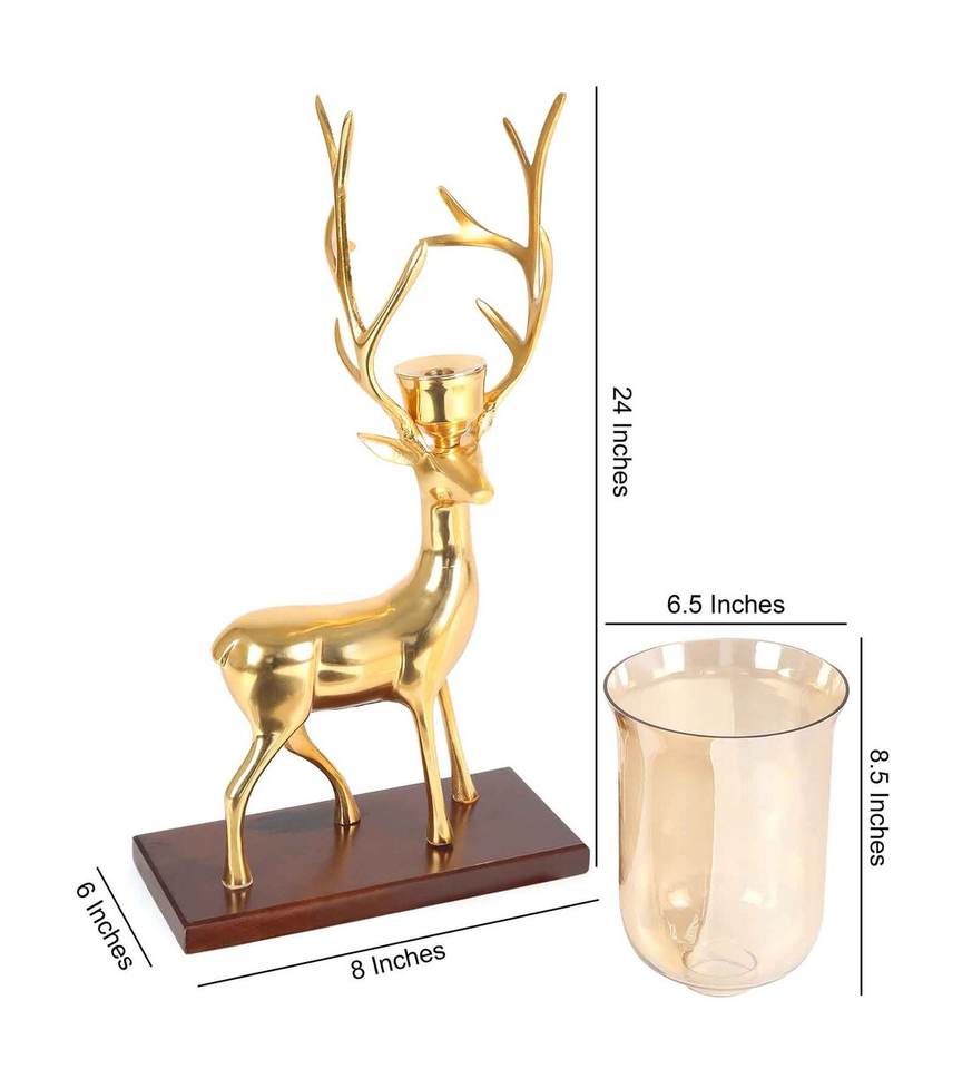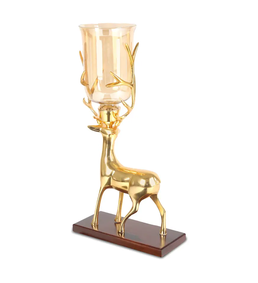 Elegance and charm home decor aluminium gold plated deer shape candle holder with wooden base