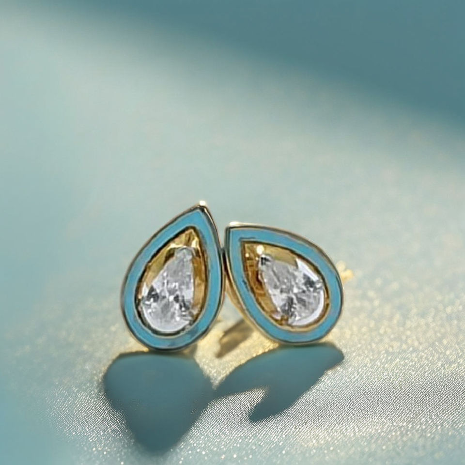 Elegant 22K Gold Teardrop Diamond Stud Earrings with Blue Enamel Border Stylish Minimal Jewellery for Women Daily Wear