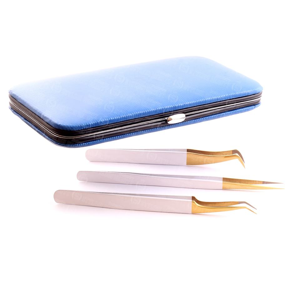Elegant 3 piece eyelash tweezer kit with blue color ideal magnetic case professional high quality customized design
