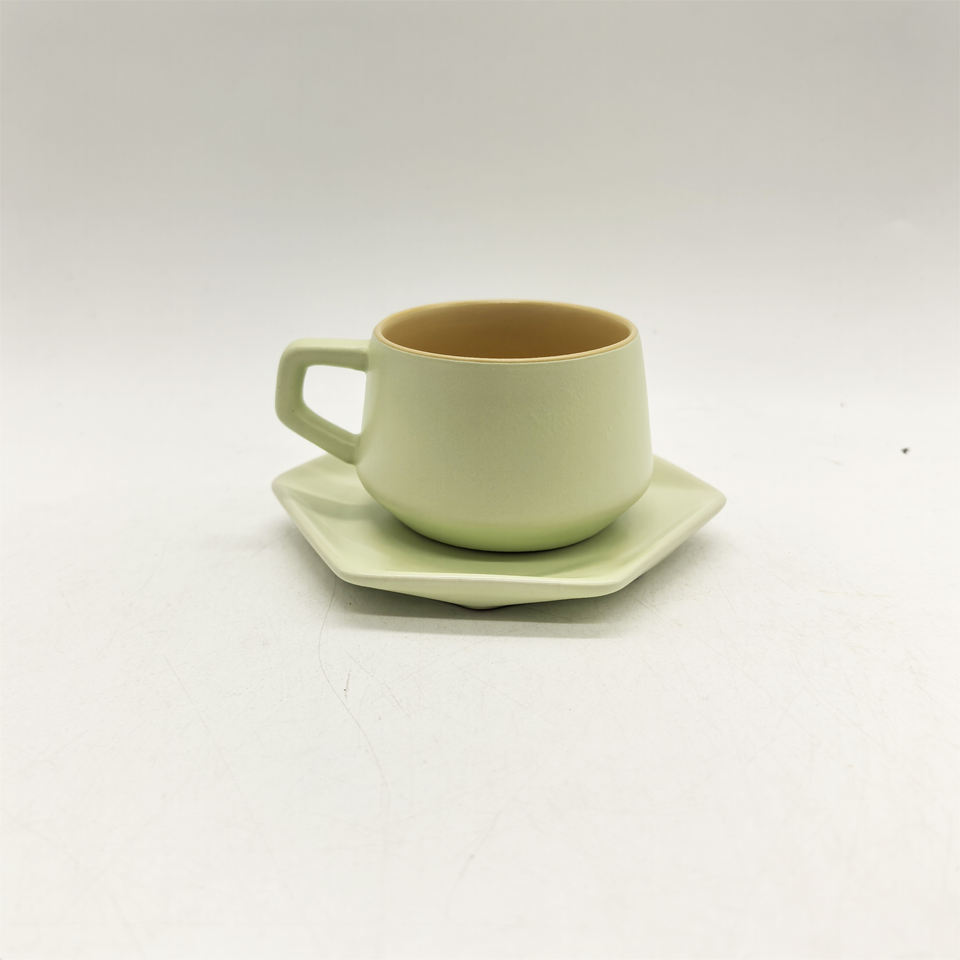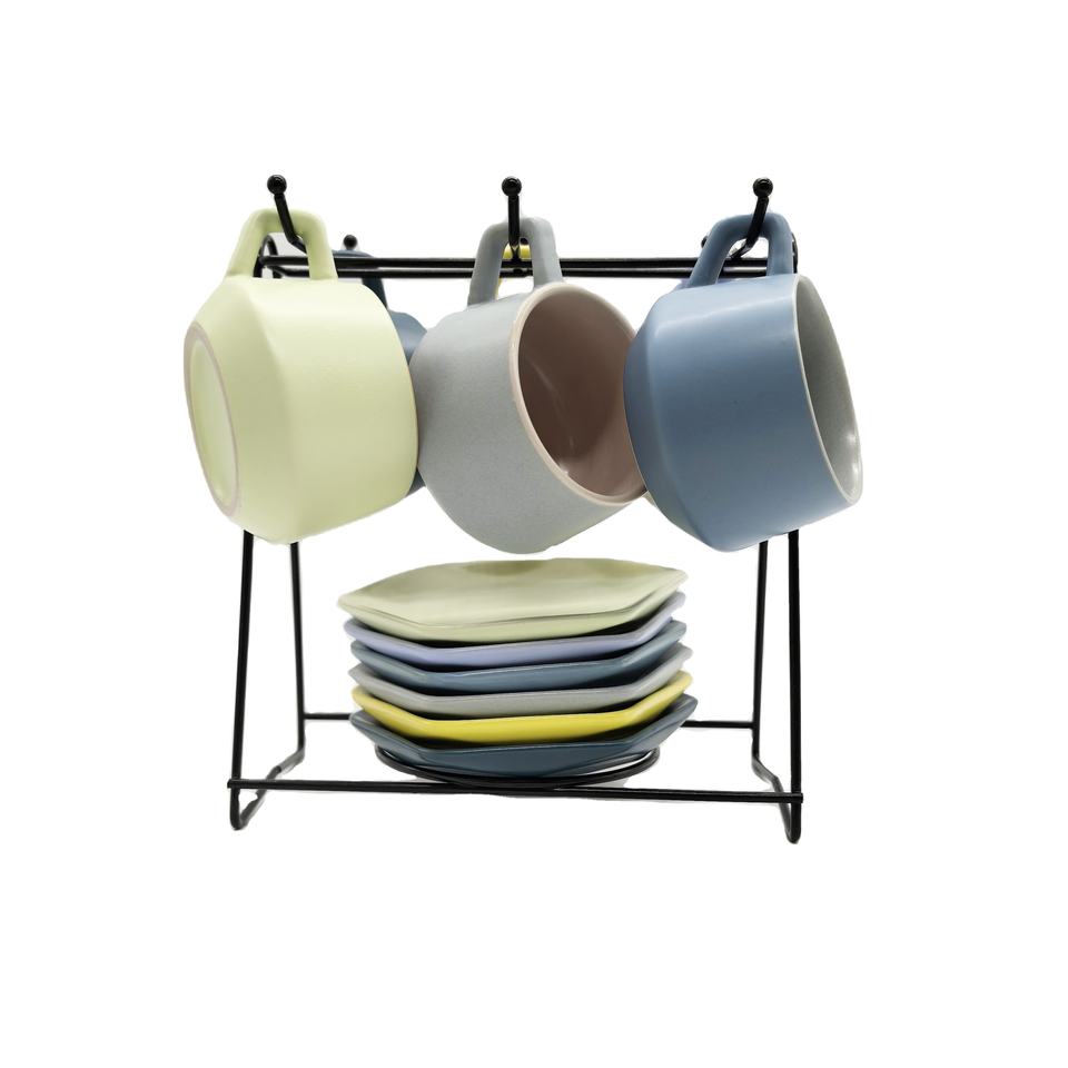 Elegant 90ml Eco-Friendly Sustainable Ceramic Mini Coffee & Tea Party Set Drum Shape Mug Hexagon Saucer Iron Rack