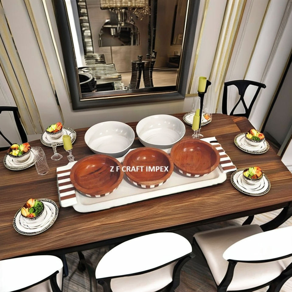 Elegant Acacia Wood Resin Design Serving Set Wooden Bowl With Metal Tray for Dinner Salad Parties Classic Style for Ramadan 2025