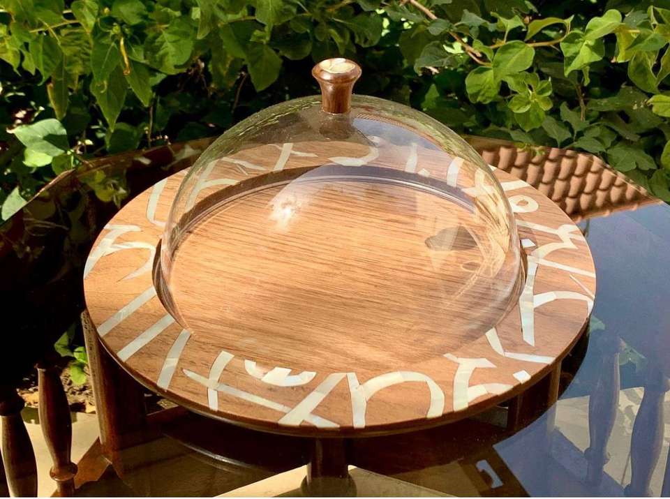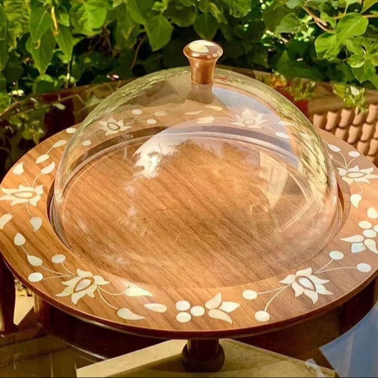 Elegant Acacia Wooden Cake Stand with Glass Lid Knob Laser Cut Mother of Pearl Inlay for Display by Craft Emporium