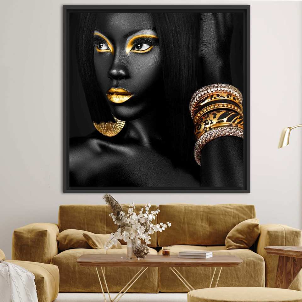 Elegant African Abstract Art Canvas Print - Gold & Black Woman Design,Black Framed