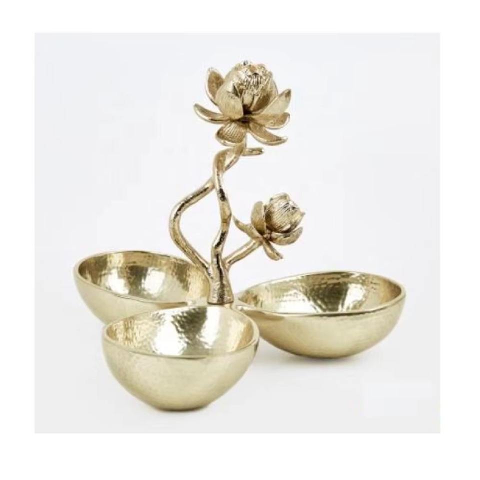 Elegant Aluminium Lotus Flower Triple Serving Bowl Decorative Snack Fruit Nuts Bowl for Dining Table and Home Kitchen Decor
