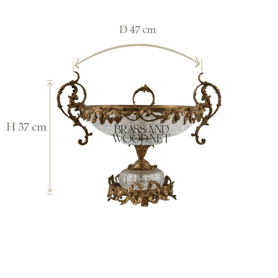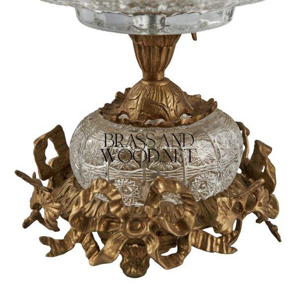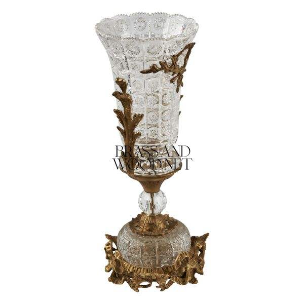 Elegant Antique Aged Brass and Crystal Decorative Centerpiece Set with Two Vases and Ornate Gold Detailing