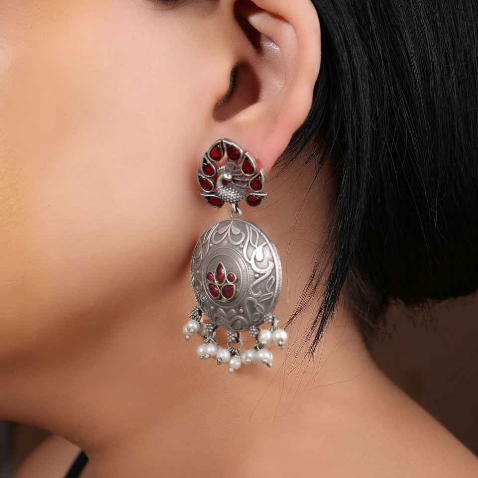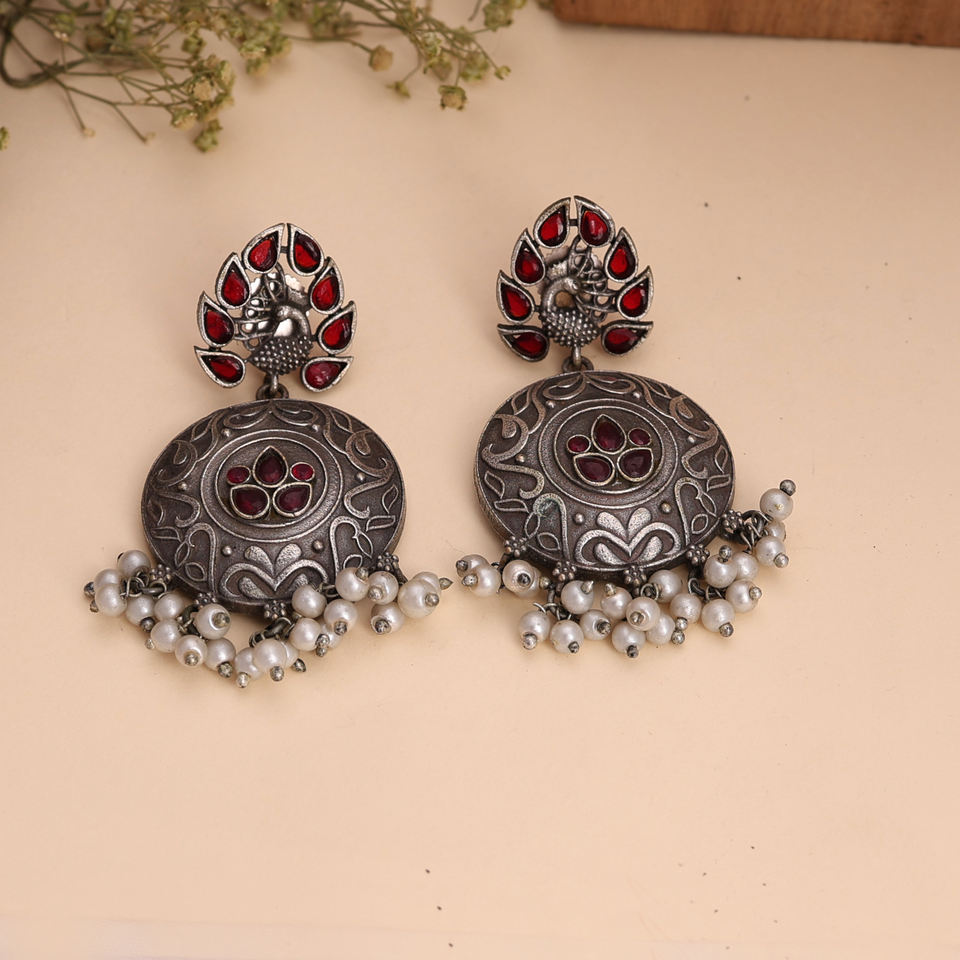 Elegant Antique Oxidized Silver Earrings with Peacock Design, Red Stones & Pearl Dangles