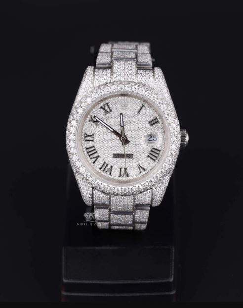 Elegant Arabic Dial White Tone Moissanite Watch From India High Quality Mechanical Movement Glass Dial Window Supplied Low Price