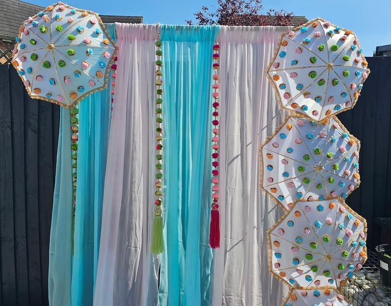 Elegant Artificial Foam Flower Umbrella Indian Wedding Backdrop Haldi Mehendi Sangeet Decorative Strings Ceiling Decoration 24