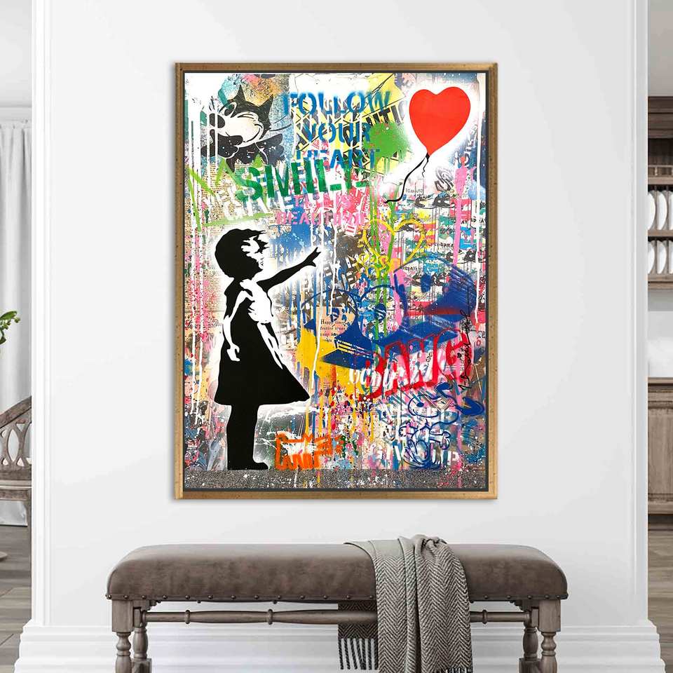 Elegant Banksy Girl Graffiti Printed Canvas Art for Living Room,Gold Framed