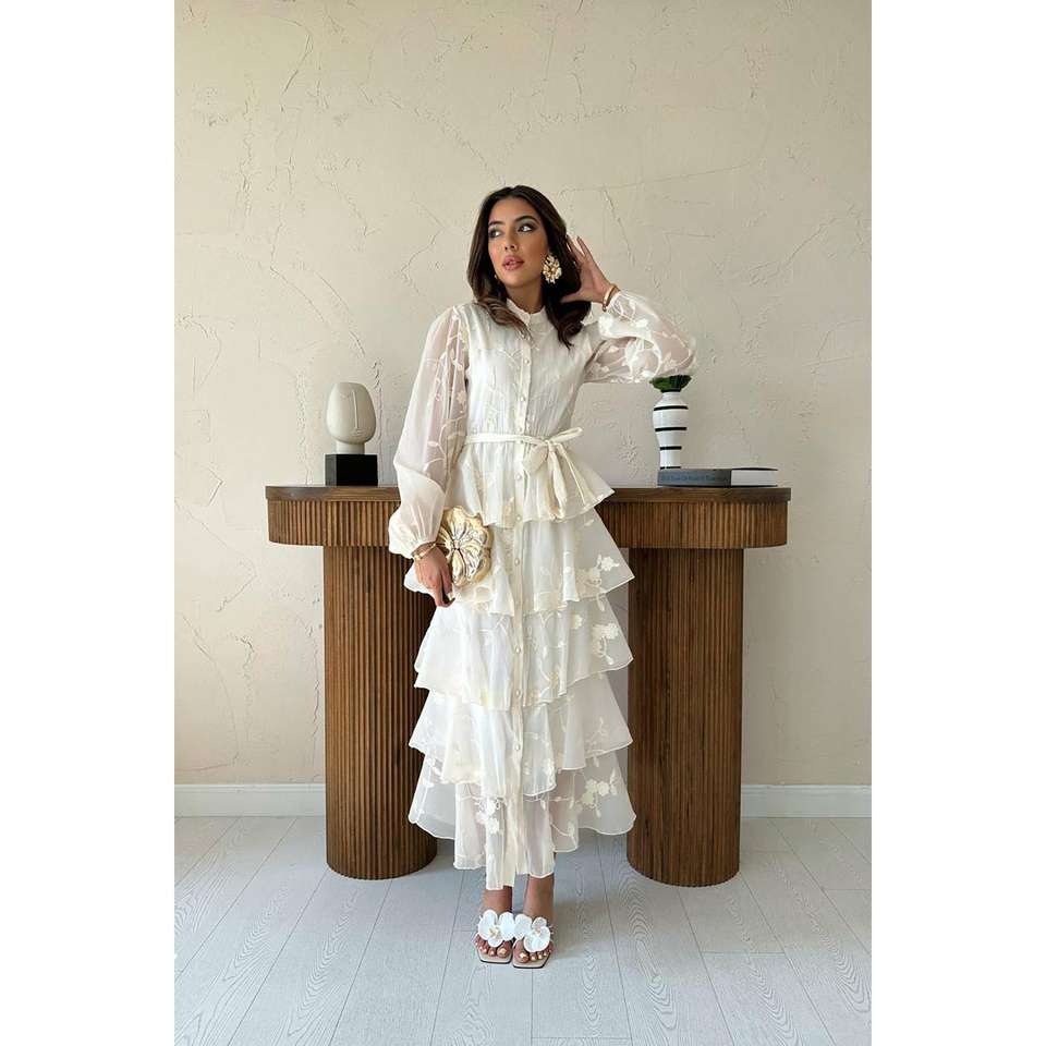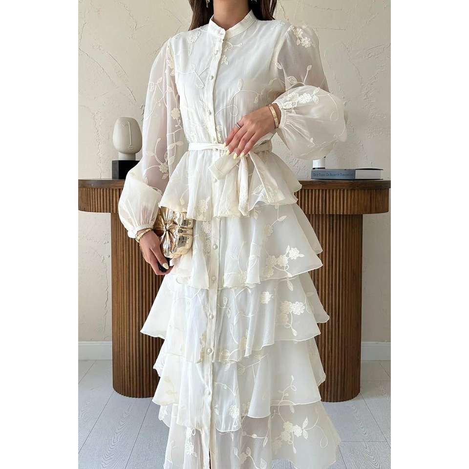 Elegant Beige Chiffon Layered Dress With Floral Embroidery A-Line O-Neck Belted Wedding Dress
