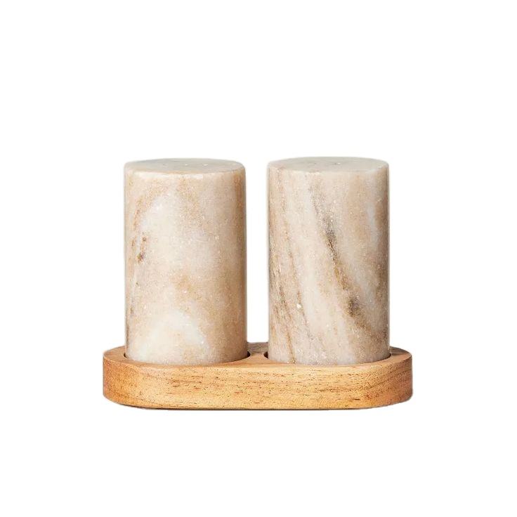 Elegant Beige Marble Salt Pepper Shakers Set with Wooden Tray for Dining Table Kitchen Decor Wholesale Price on Sale