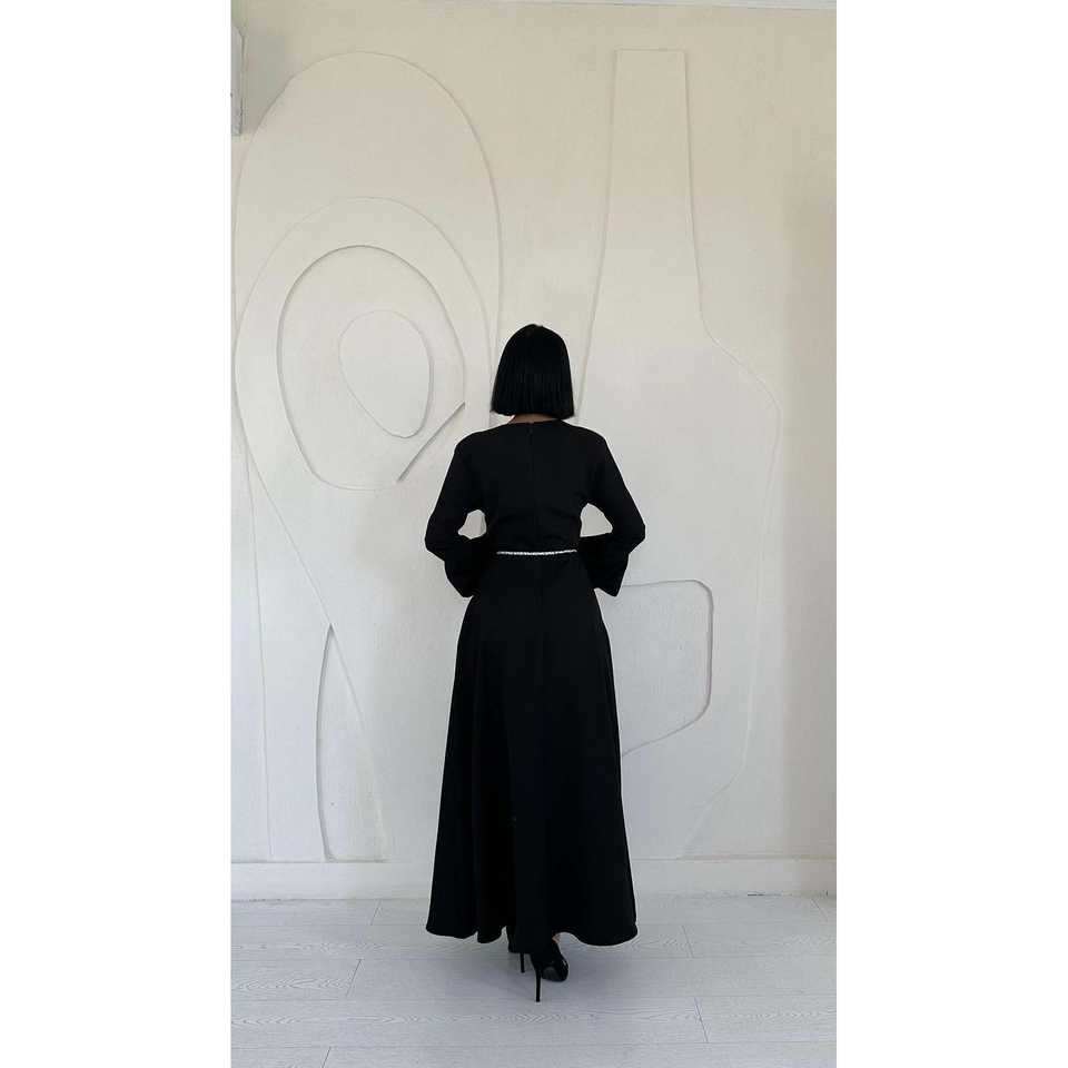 Elegant Black Balloon Sleeve Belted Dress A-Line O-Neck Crepe Long Formal Wedding Gown Women's Fashion