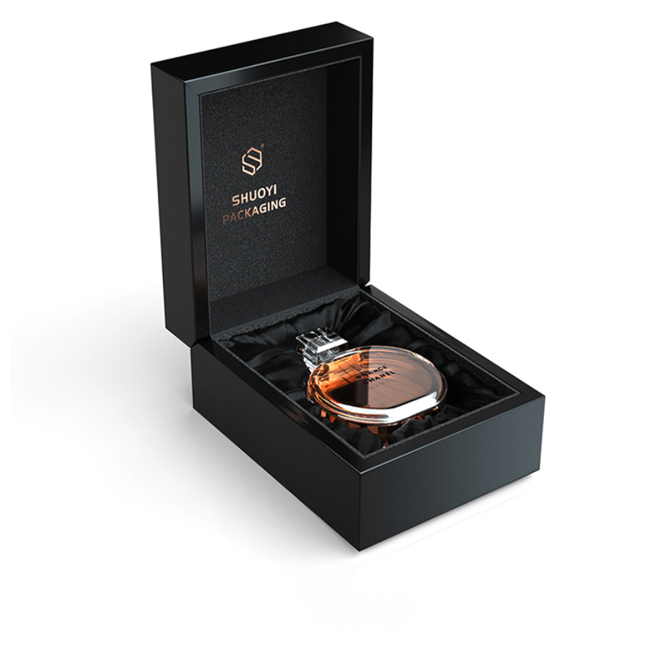 Elegant Black High-Glossy Rectangle Storage Box Package MDF Wood Laser-Cut Perfume Custom Highend Luxury Handmade Personal Care