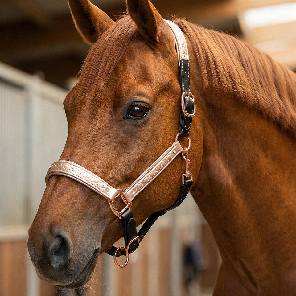 Elegant Black Leather Horse Halter English Saddle Rose Gold Padded Noseband Crown Quilted Detailing Premium Equestrian