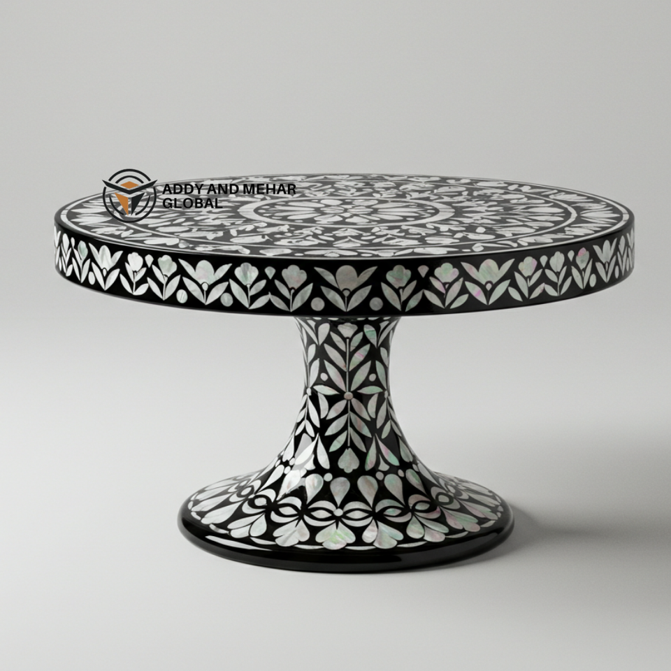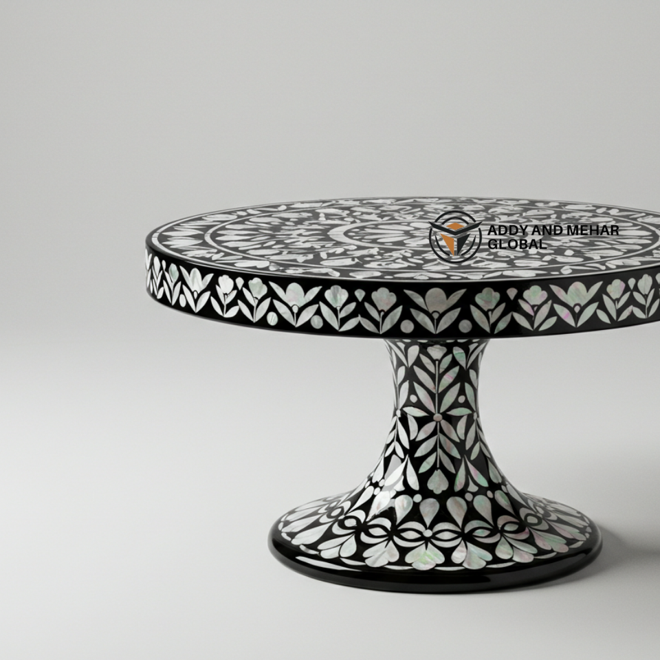 Elegant Black MOP Inlay Wooden Cake Stand Handmade Floral Pedestal for Cakes & Pastries