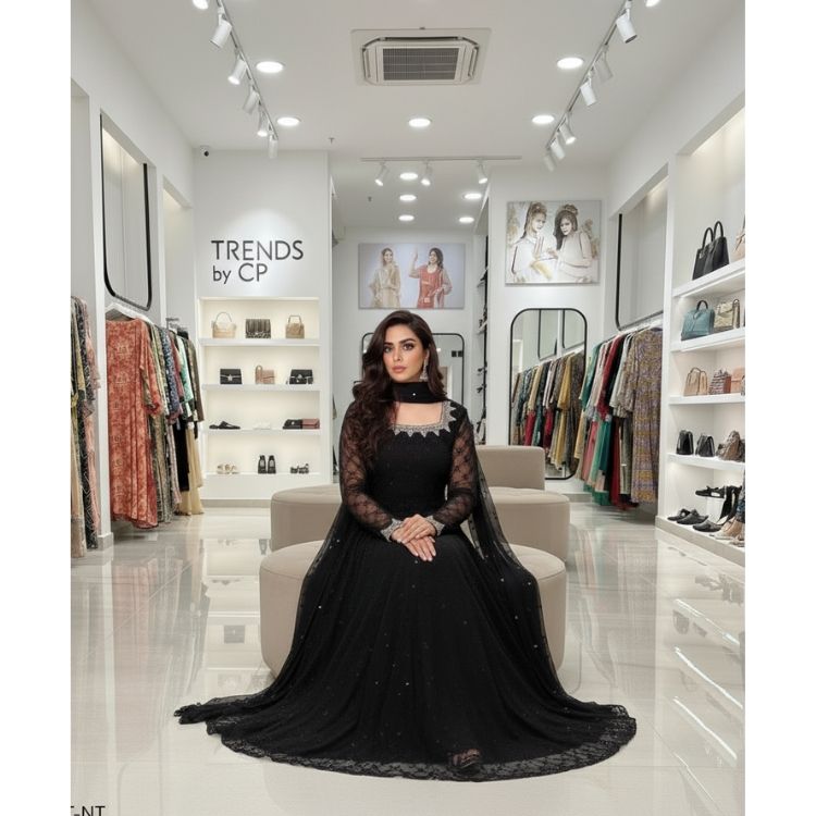Elegant Black Net Anarkali Suit | Pakistani Formal Wear Dresses | Hand-Embellished Long Frock Dupatta Salwar Kameez for Party
