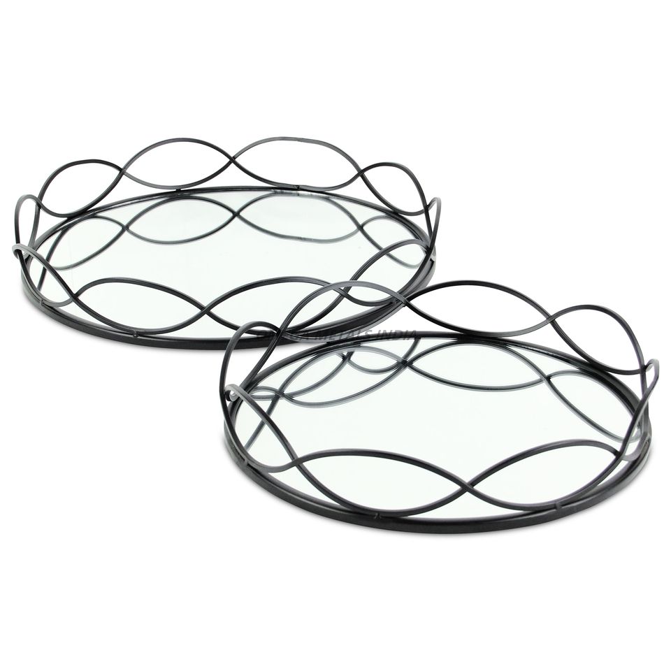 Elegant Black Round Serving Trays With Glass Bottoms and Decorative Metal Design Ideal for Displaying Treats and Drinks